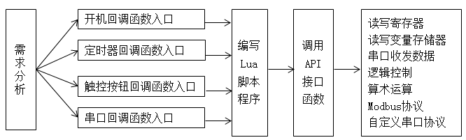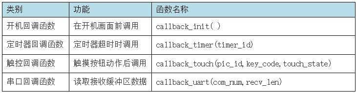 用戶根據(jù)應(yīng)用需要,在回調(diào)函數(shù)里編寫(xiě)Lua腳本程序,并下載到串口屏里。串口屏?xí)鶕?jù)回調(diào)函數(shù)類(lèi)型,在不同的時(shí)間點(diǎn)執(zhí)行對(duì)應(yīng)回調(diào)函數(shù)里面的用戶Lua腳本程序。